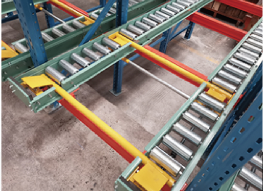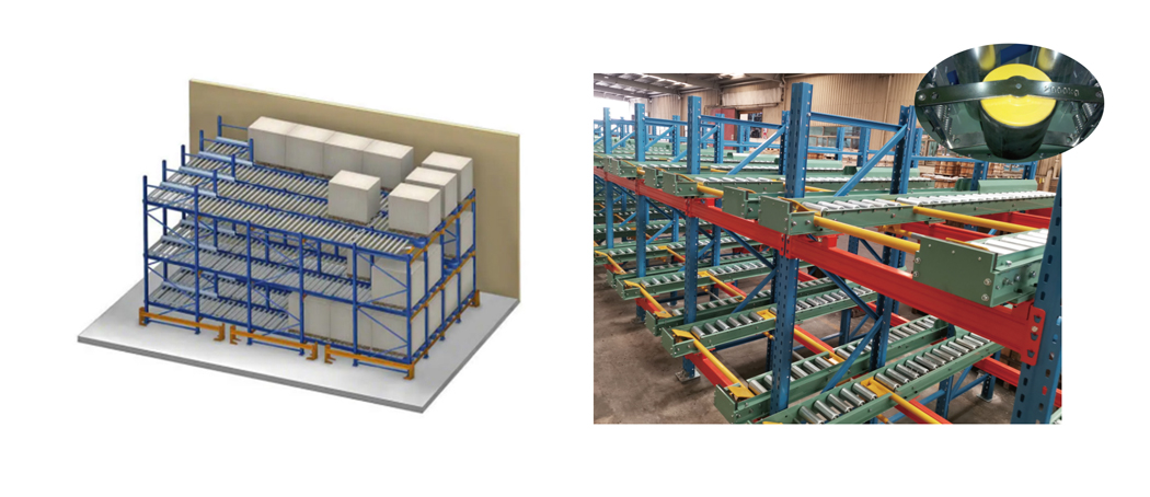 Rafturile de tip gravitație și rafturile cu role cu alunecare auto-alunecare au o structură similară cu rafturile de tip fascicul, dar piesele cu role care nu sunt alimentate sunt instalate pe grinzile rafturilor, iar unghiul de înclinare al pistelor cu role este în general de 2-5 °. Rafturile de gravitație folosesc acest unghi de înclinare și greutatea mărfurilor în sine pentru a aluneca automat de la mare la scăzut. Rafturile de gravitație sunt potrivite pentru produsele în interior și cu flux ridicat. Principalele lor caracteristici sunt utilizarea spațiului ridicat, iar raftul nu necesită energie externă. Acestea sunt potrivite în special pentru gestionarea de depozite mari, cum ar fi centrele de depozitare la rece și distribuție logistică și pot fi operate de stivuitoare obișnuite echilibrate.